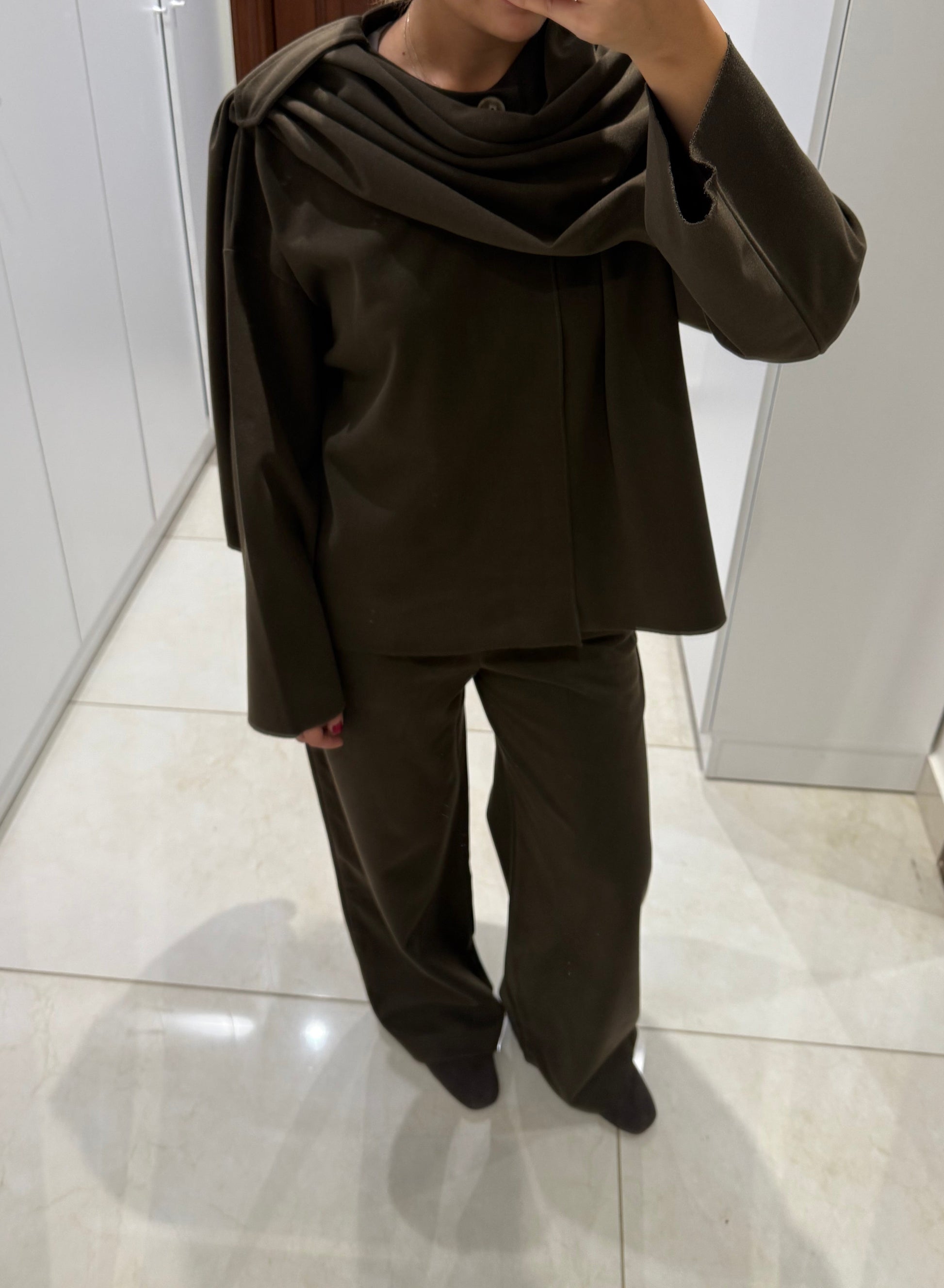 A soft wool-blend set featuring a one-size scarf jacket with an elegant draped neckline, paired with relaxed tailored trousers. Effortless, refined, and easy to style together or separately.