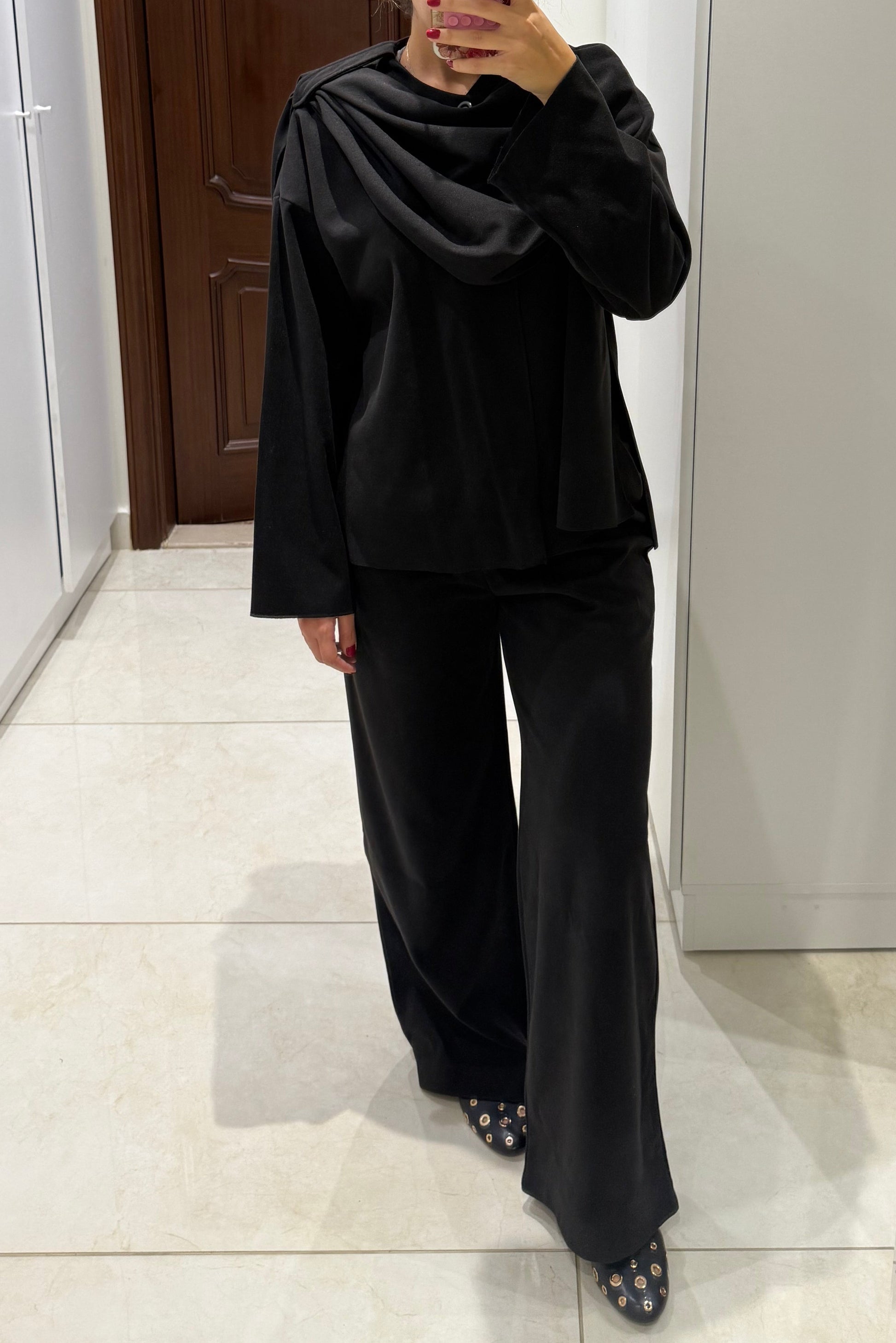 A soft wool-blend set featuring a one-size scarf jacket with an elegant draped neckline, paired with relaxed tailored trousers. Effortless, refined, and easy to style together or separately.