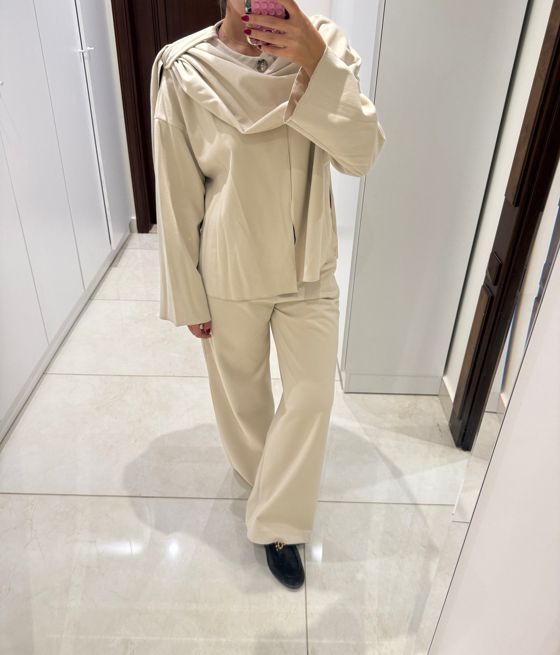 Tailored wool-blend trousers with a relaxed yet refined fit. Designed to complement the Camille Scarf Jacket or be worn on their own for timeless sophistication.
