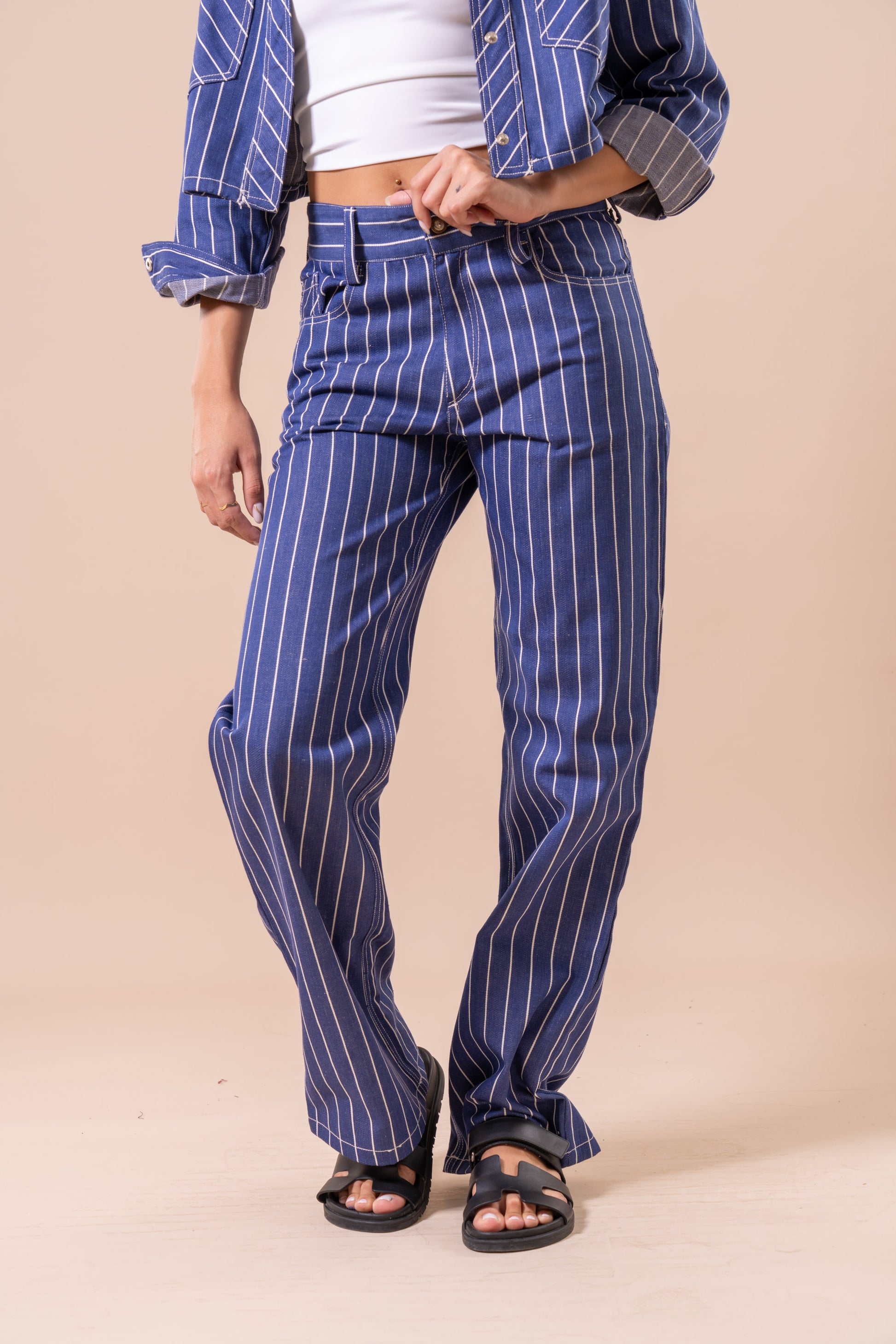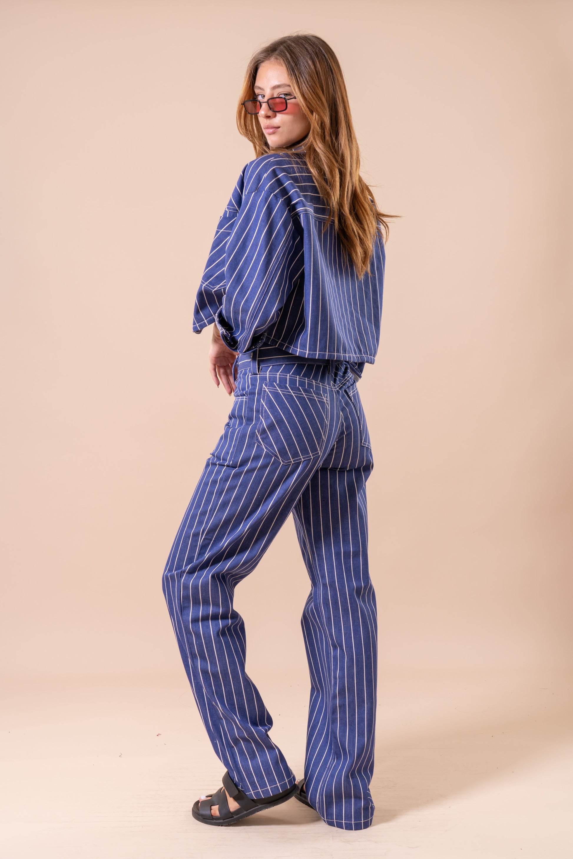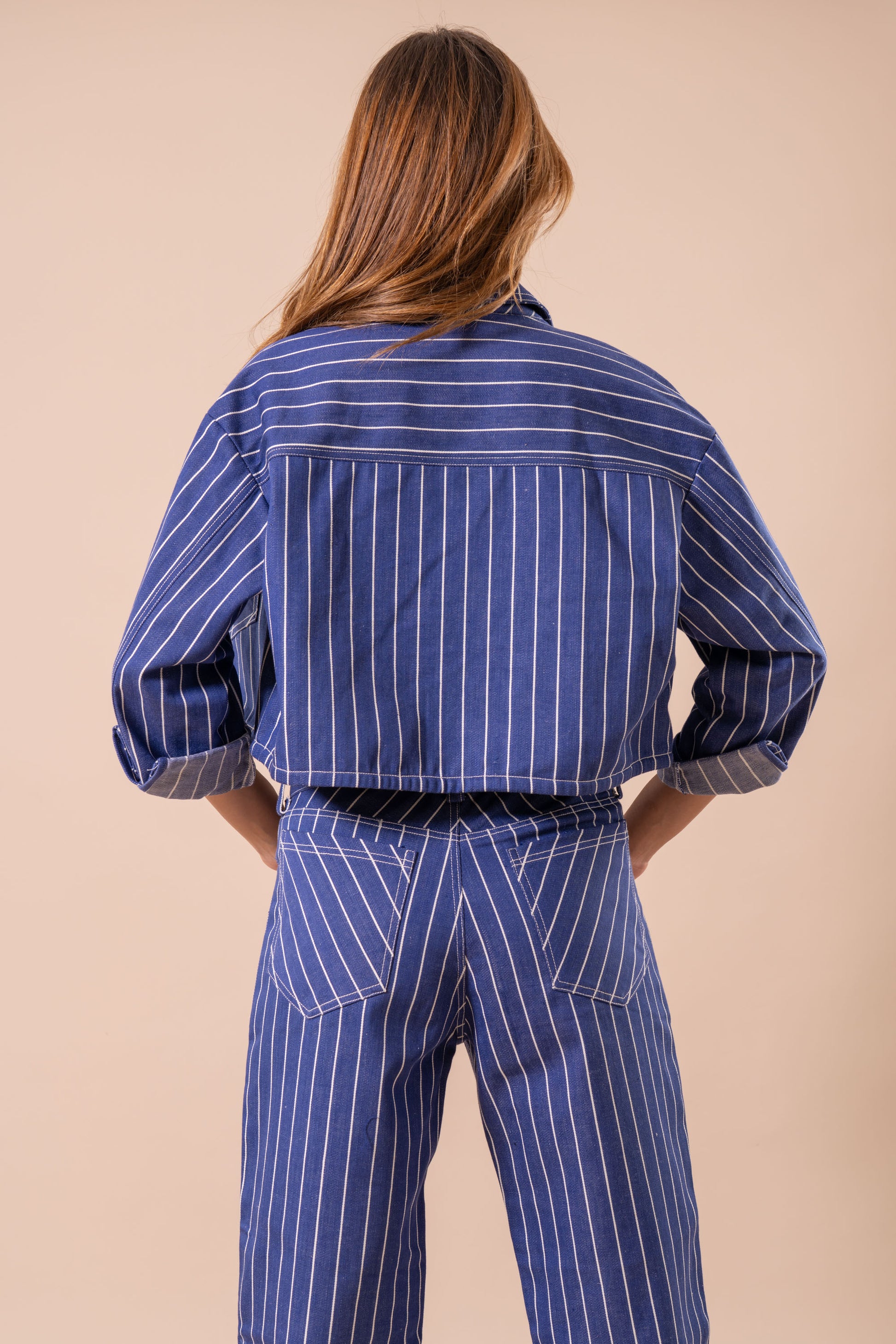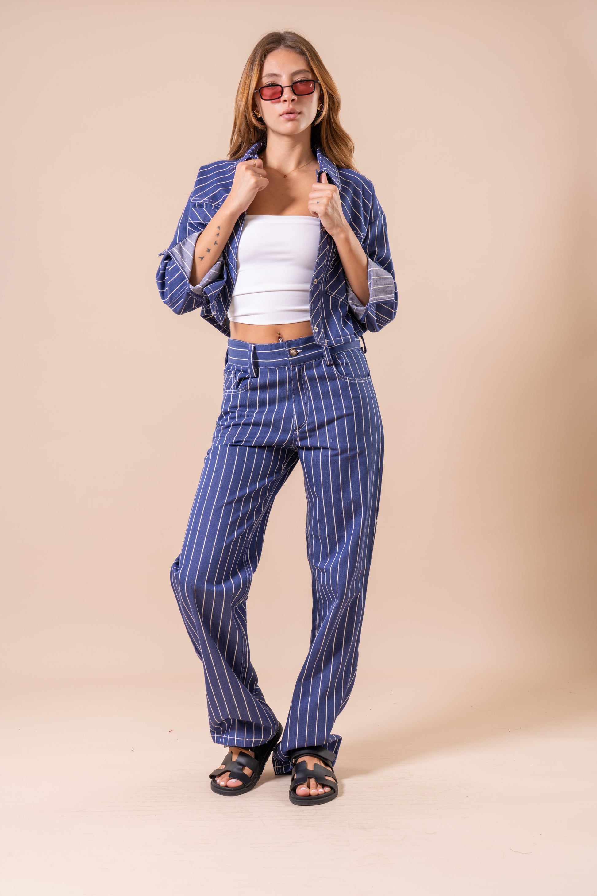A striped denim jacket paired with matching jeans. Relaxed yet polished — perfect for effortless daytime looks.