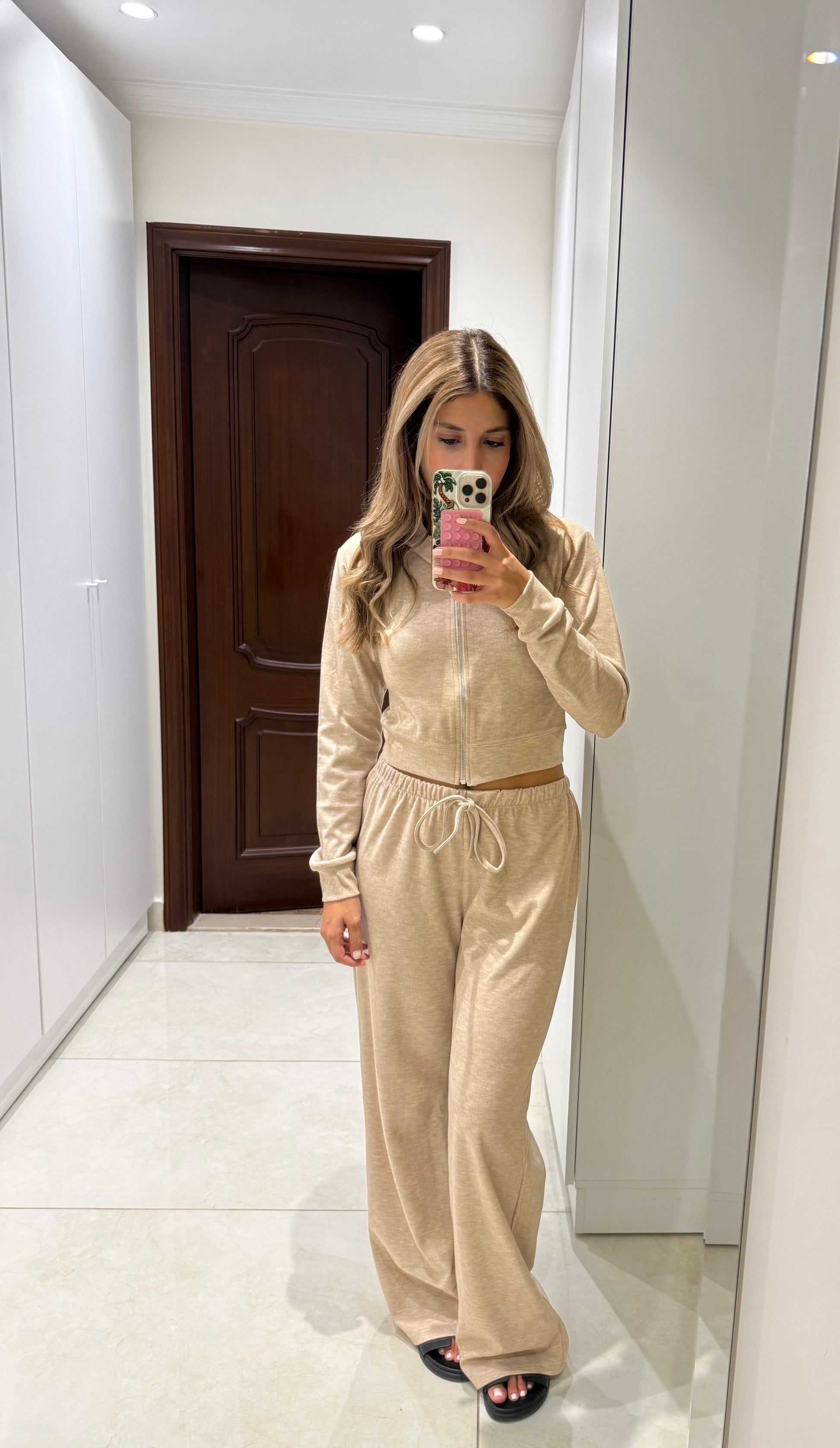 Effortless comfort meets everyday style. This set features a cropped zip-up jacket with a double-lined hood, crafted from a high-quality viscose blend for a soft, premium feel. Paired with matching wide-leg pants with a drawstring waist for the perfect relaxed fit. Ideal for travel or casual days out.