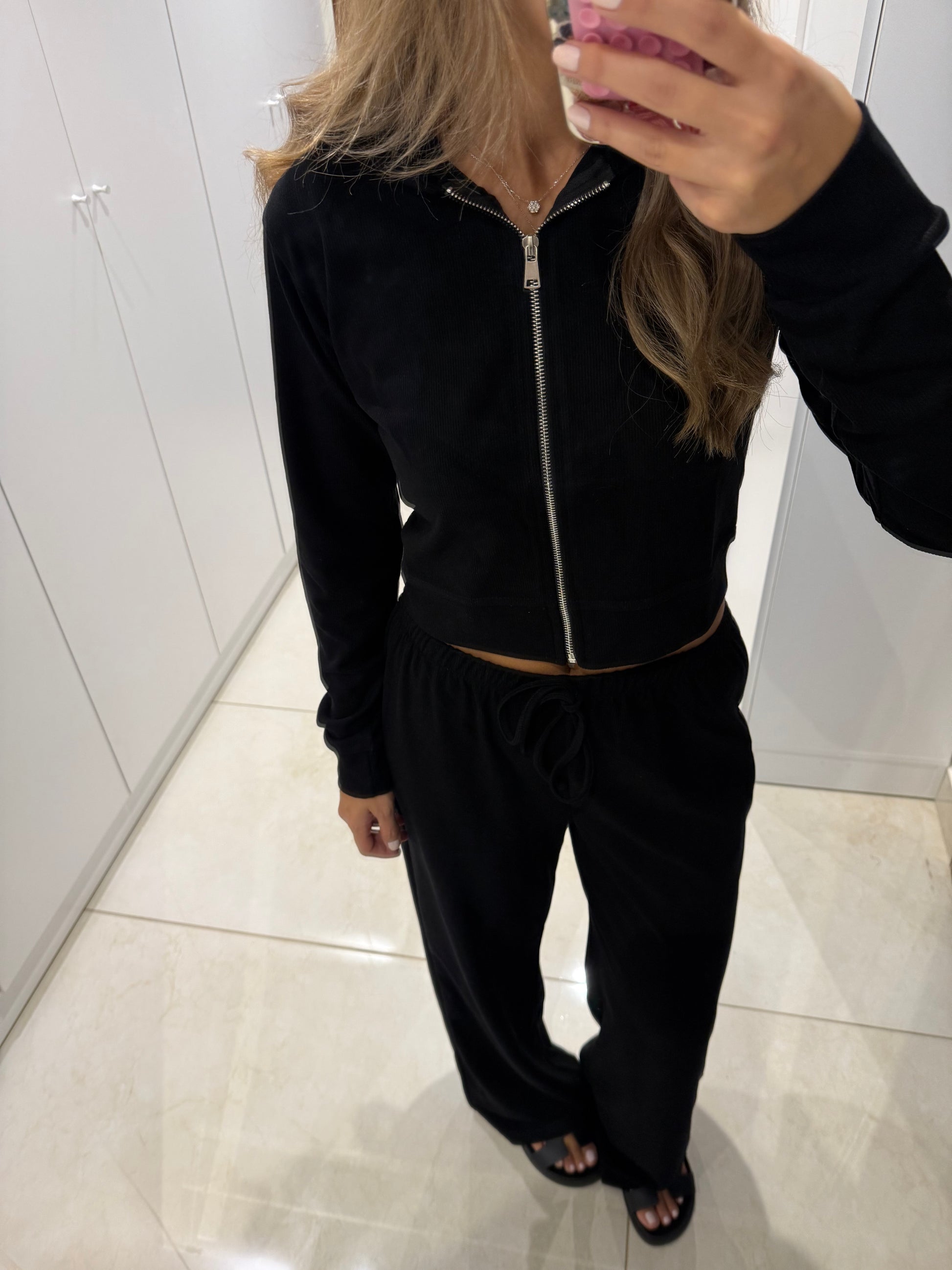 Effortless comfort meets everyday style. This set features a cropped zip-up jacket with a double-lined hood, crafted from a high-quality viscose blend for a soft, premium feel. Paired with matching wide-leg pants with a drawstring waist for the perfect relaxed fit. Ideal for travel or casual days out.