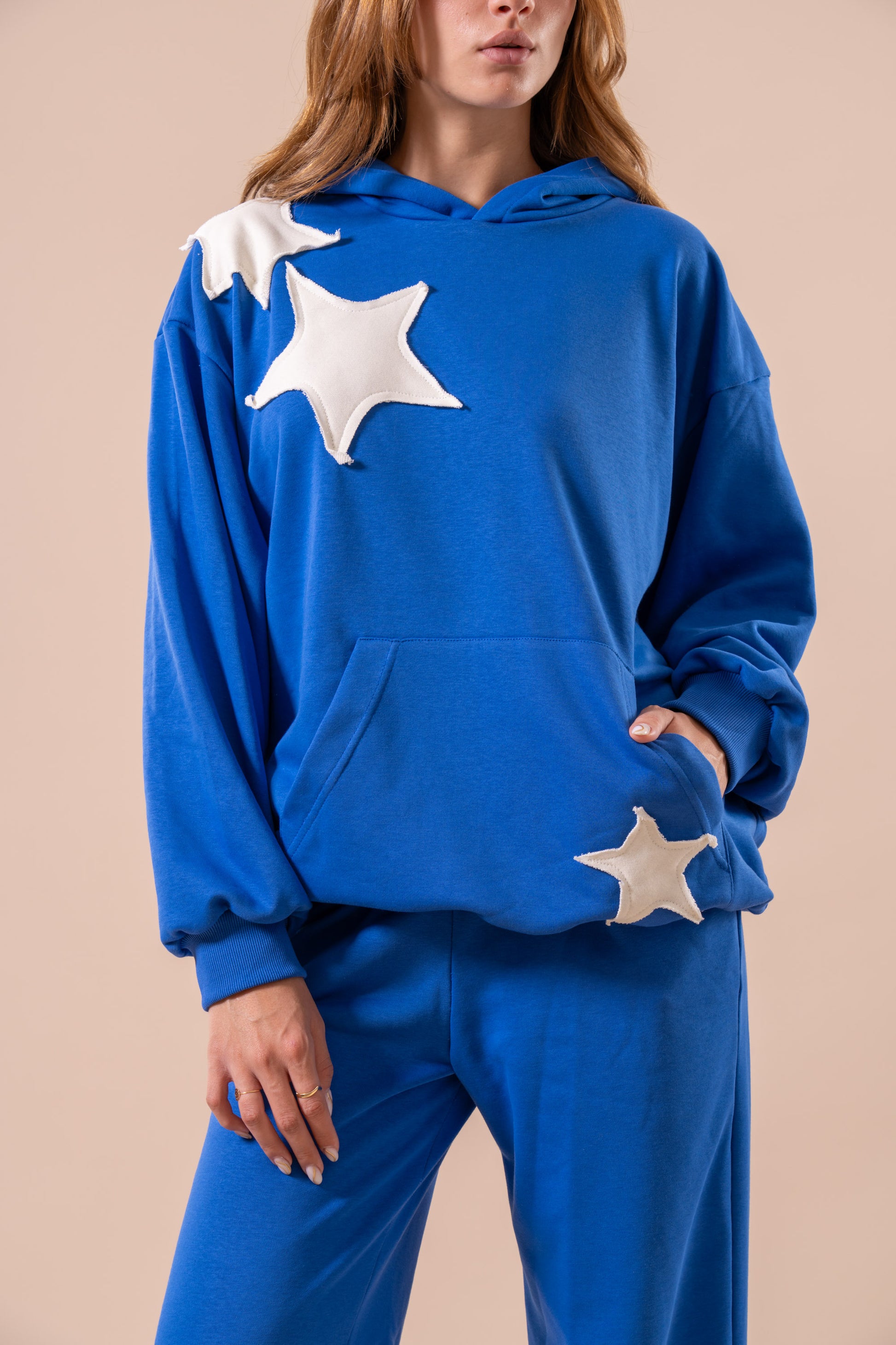 A cozy cotton-blend French terry sweat set that shines bright in royal blue. Features off-white embroidered star patchwork and a relaxed hoodie paired with wide-leg sweatpants. Effortlessly comfy yet celestial-chic — for your off-duty, dreamy days.