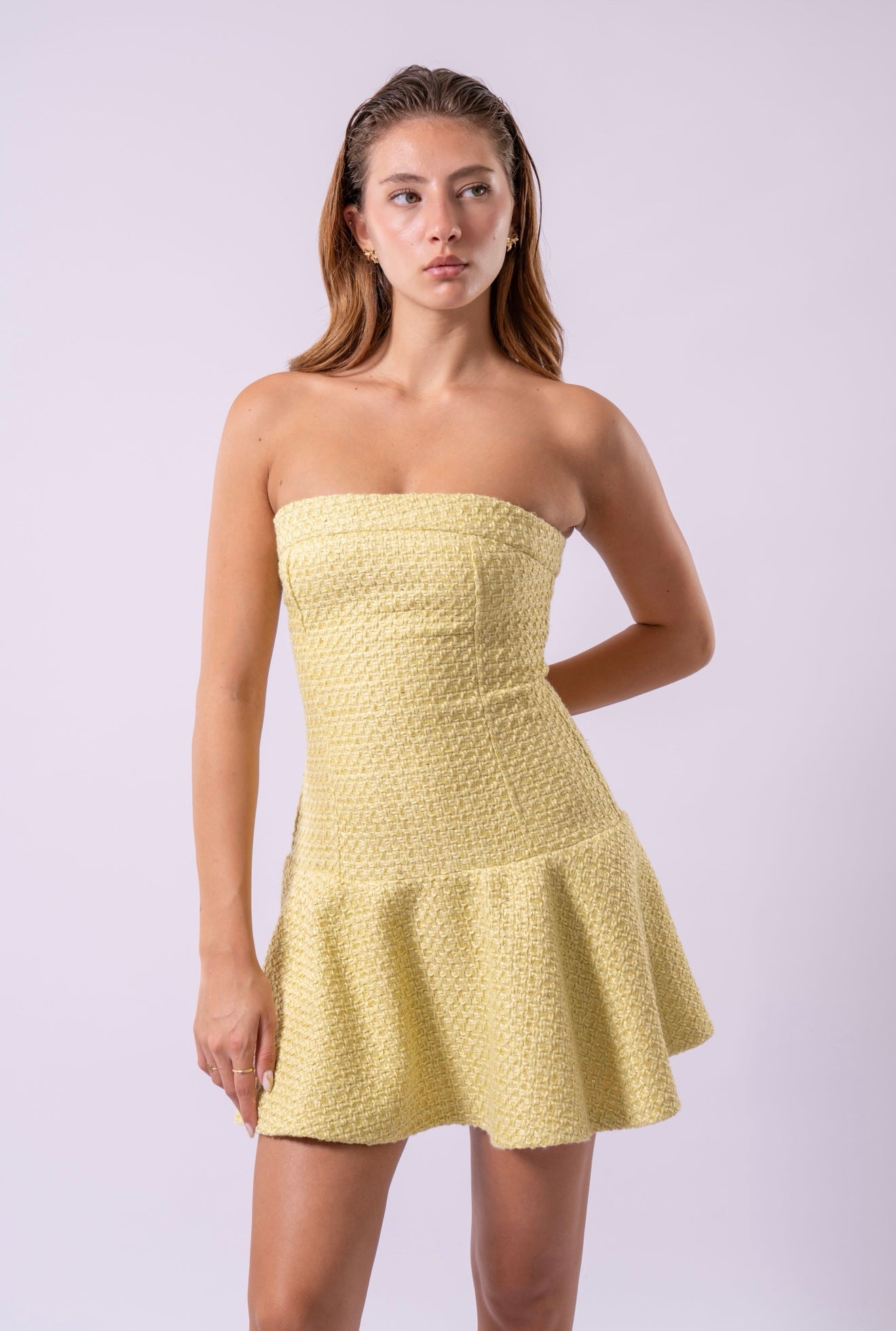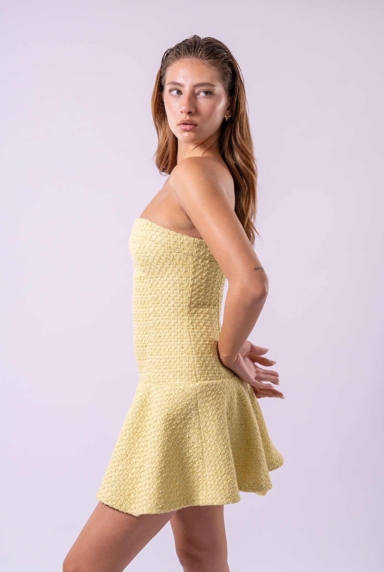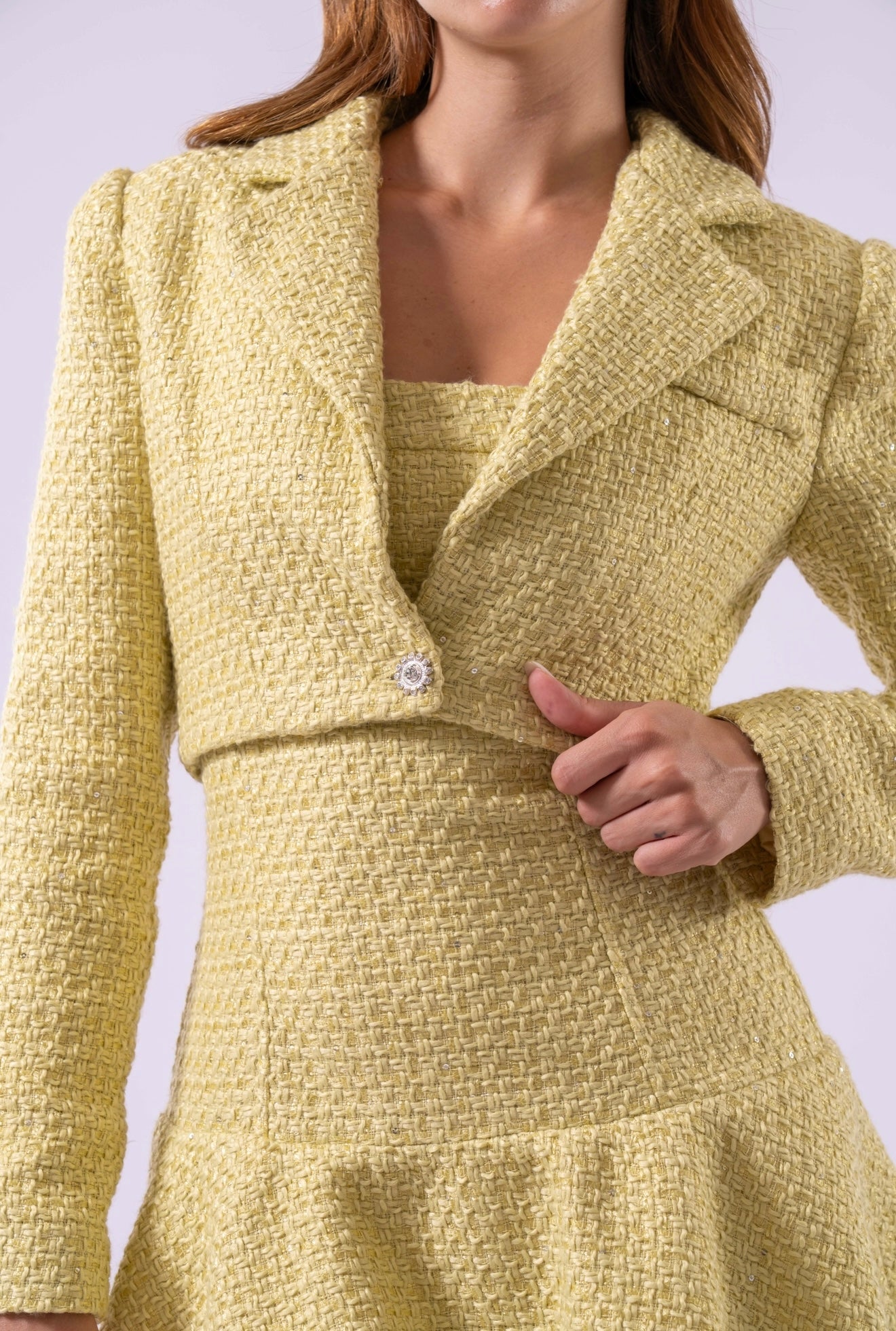 A strapless tweed dress with a sleek zip-back closure, paired with a matching bolero featuring sparkling crystal buttons. Elegant and effortlessly polished.
